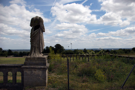 All that remains of the Palace are its concrete foundations and the terraces and ornamental gardens which surrounded it. I find an appropriate place to stand in the centre of the site, from which I can appreciate the sheer scale of the building that once stood here. I try to imagine myself standing in the central boulevard that ran through the main axis of the Palace. I picture the full-grown trees, industrial machines mounted on ornate carved wooden plinths, and a host of other manufactured curios and objects collected from the remotest corners of the British Empire. Around them stand throngs of Victorian visitors, presumably sweating profusely in their garb as they are subjected to the intensity of the sun’s rays refracted through the weightless glass roof above them. Unable to sustain the illusion, I wander ‘outside’ and inspect the sorry remains of the sculptures and statues that line the outdoor terraces. On one hand these figures did well to survive the intense heat and calamity of that November night in 1936. But then again, maybe this survival was their misfortune, for once the main attraction to which they owed their existence was gone, time took the opportunity to humiliate them further. Many figures have had their heads knocked off, and from their innards now protrude beer cans and other detritus. Only the sphinxes that guard the upper terrace steps have managed to maintain some semblance of dignity. They are particularly redolent as they stare out unblinkingly across the south London landscape, almost as if they were expecting the glories of the Empire to imminently reappear on the distant horizon.