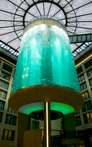 This is turn reminded me of the city’s current aquarium attraction—the Aquadom—located on Karl-Liebknecht-Straße, whose main feature—a giant cylindrical fish tank occupying the space above the reception area of the Radisson Hotel, and which is free for anyone to see—remains as equally well-hidden from passersby on the street outside. For a long time I was oblivious of this free spectacle, having walked past it unawares countless times previously, until one summer, while I was staying in Berlin, a friend tipped me off of its existence by email. On a bright afternoon a few days later, while walking from the reading rooms of the Zentral Bibliothek on Breitestraße towards the train station on Alexanderplatz, passing close by the Radisson Hotel in the process, I remembered the tip-off and, being in no particular hurry, decided to investigate for myself.