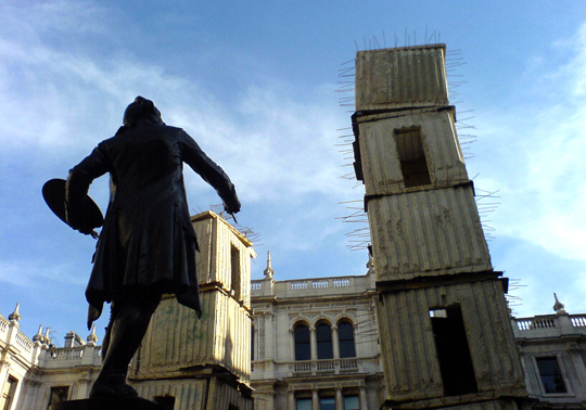 I feel obliged to briefly digress here, for this change of direction, from the Rathausstraße to the Radisson Hotel, took me through the Marx-Engels Forum—another Berlin landmark that has undergone irrevocable alternation in readiness for the proposed U55 underground extension. That summer was an especially warm one, even by Berlin’s standards, and I can still recall as if yesterday, the sense of relief I felt as I passed from the harsh sunlight of the street into the cooler shade of the trees clustered in the square. I deliberately avoided the circular forum, where the sun beat down upon Marx and Engels, who were admirably tolerating the sightseers lining up to take their photographs. Instead I stuck to the Spree side of the park, looking across boats filled with hordes of tourists, towards the remains of the Palast der Republik, at that stage little more than a hole in the ground punctured by giant concrete columns, that put me in mind of Anselm Kiefer’s Jericho that I’d seen at the Royal Academy in London a year or so earlier.