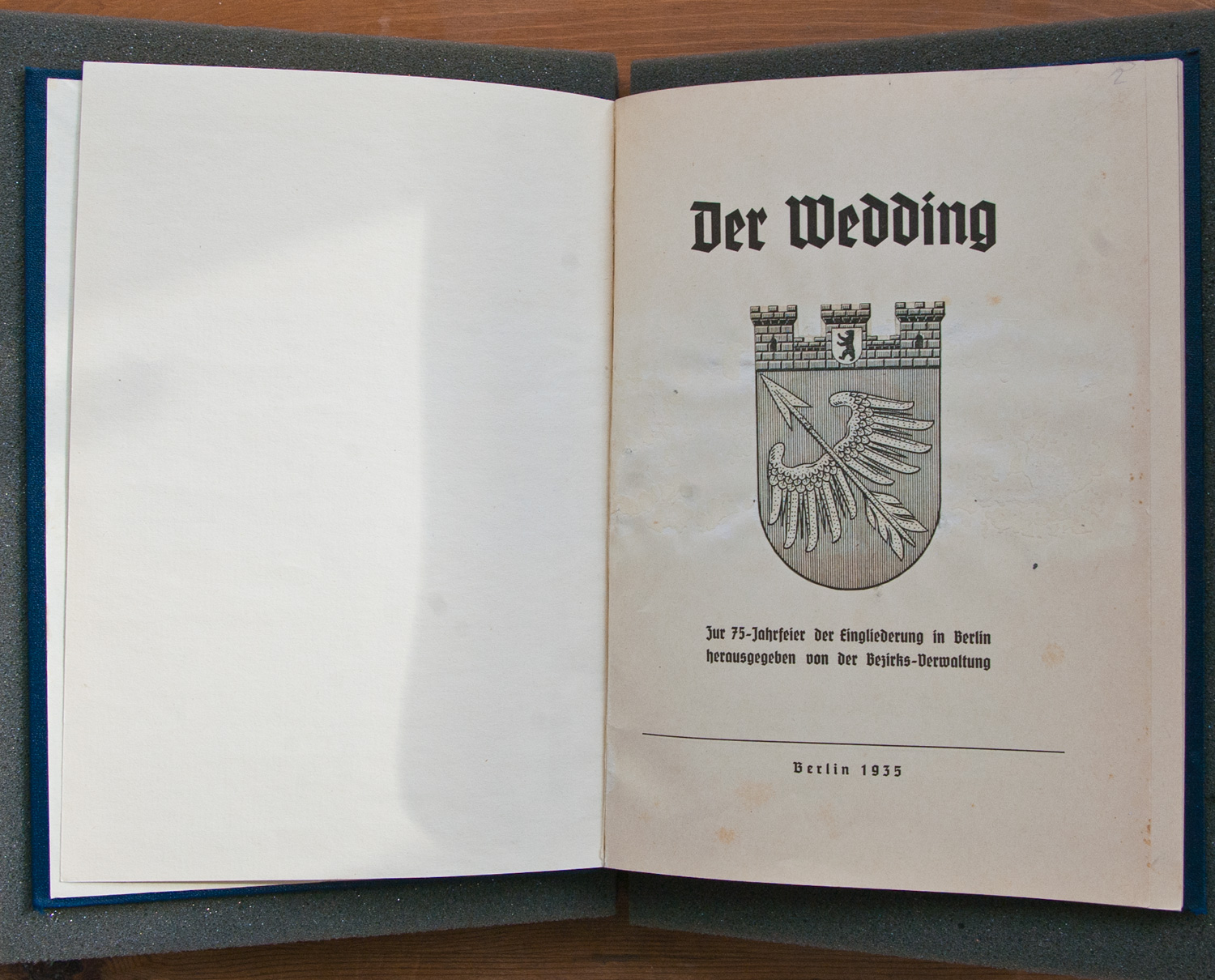 Amongst the books that inhabit my bookshelves, there are two that are historical accounts of the north Berlin district of Wedding. The first book is Franz Gottwald’s Heimatbuch vom Wedding, published in 1925. The second, entitled Der Wedding was published by Wedding’s municipal authority in 1935, to commemorate the seventy-fifth anniversary of the district’s incorporation into Berlin. Both were published in Berlin, both were at some point most likely owned by inhabitants of Wedding, and both were eventually brought by myself from Berlin-based second-hand bookshops through the internet.
