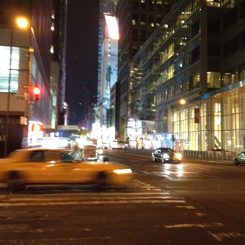 The junction at 5th Avenue was bathed in streetlight hues of black and white. The streets were silent and empty, the only noise and movement coming from yellow taxis streaking past through green traffic signals. Straight ahead, turn right, straight ahead, turn left. At Times Square, the blazing lights and looping animated billboards turned night into day, and the few people that lingered here were silhouetted by shop window displays and illuminated advertisements.